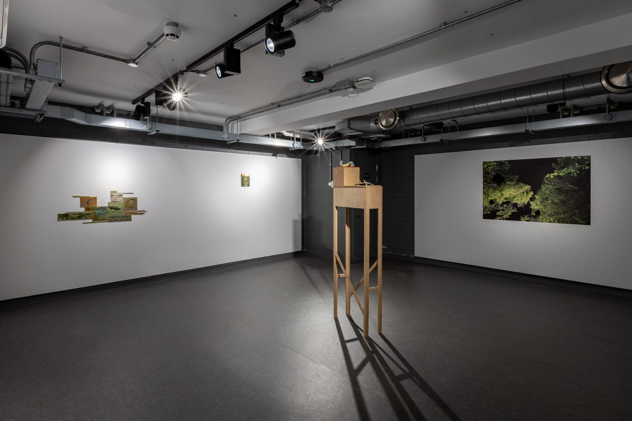 Whittle’s work gathers many sources to construct a multilayered terrain of accumulated time and the residue of our being within it. In her works resulting from the residency, she pulls together fragments from photographs from WW1 with images of ruins from Pompei; relocating both in dark pine forest, so together they form a site of ritual and ruin from an immemorial past. Combined with these, fragile postcards depicting trees from photographs of a tree planting ceremony on a housing estate in Dewsbury in 1962, become souvenirs of these oblique acts, whilst wooden panels inspired by a 1955 text on the ‘Imitation of Woods and Marbles’ depict fading structures in the landscape, overgrown and falling into this layered and unceasing narrative of time.